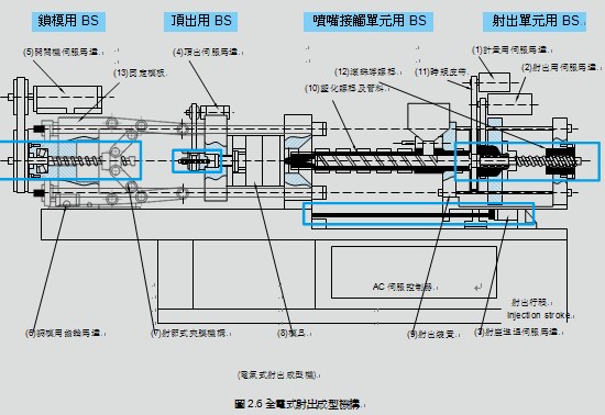 若致動器中採用滾珠螺桿取代傳統的汽壓或液壓驅動可得到許多的優點如:不會滲漏,不須過濾,省能源及重現 性高 圖2.6為全電式射出成型機構,以取代傳統複雜的油壓驅動。