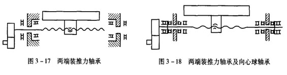 如圖3-16所示,這種方式可用于絲杠較長的情況。應將推力軸承遠離液壓馬達等熱源及絲杠上的常用段,以減少絲杠熱變形的影響。