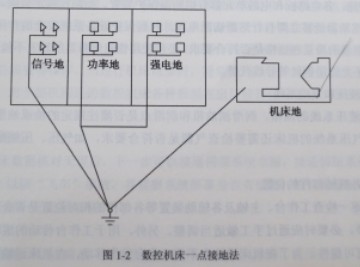 ????? 數(shù)控機(jī)床的接地采用一點(diǎn)接地法.即輻射接地法.如圖1-2所示。