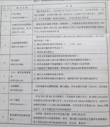 ??SIEMENS S1OT/1“系統的硬件采川模塊化結構,主要由CPU模塊、位置測量控制模塊、系統程序存儲器模塊、文字圖形處理器模塊、接口模塊、電源模塊、監視器和監視器控制模塊等組成,其組成部分如表2-2所列。